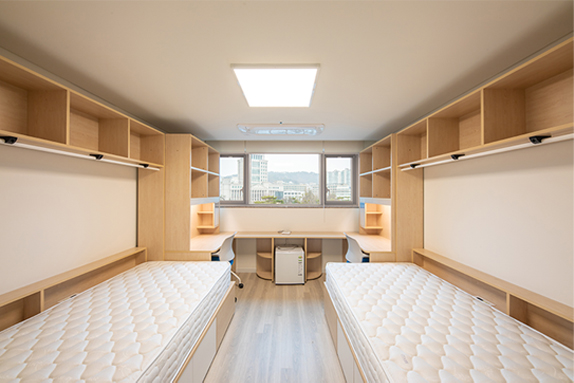 천정형 개별 냉방시스템 도입(최신 공기정화시스템 포함) / 건강 온돌난방 포함 샤워실 및 화장실 구분, 인터넷 / 통합 출입통제 시스템(CARD KEY)